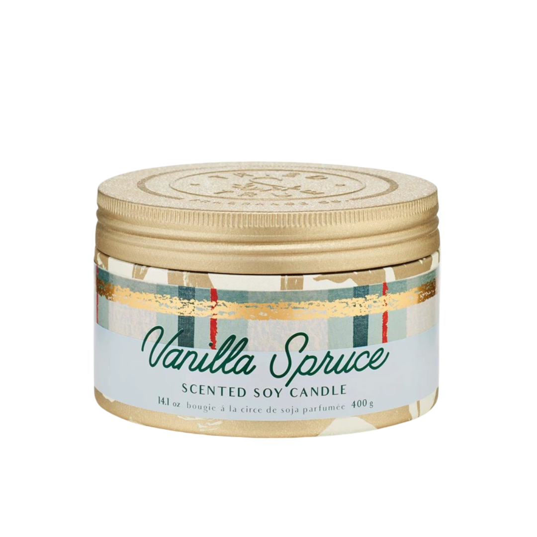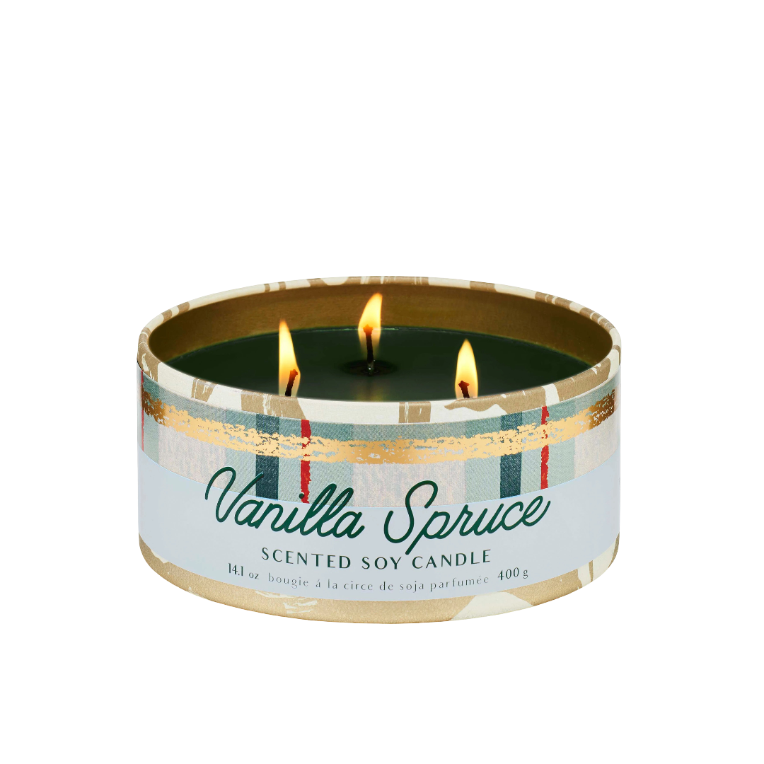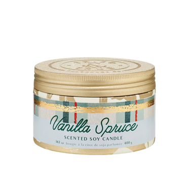 Notes of eucalyptus, sweet vanilla, and winter spruce in this soy candle with decorated tin with lid.