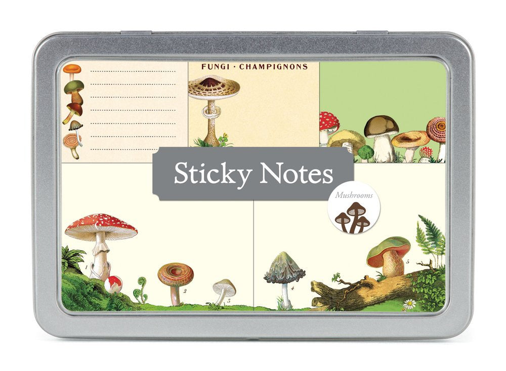 Packaged in a tin with 5 sticky note pad designs in assorted sizes.