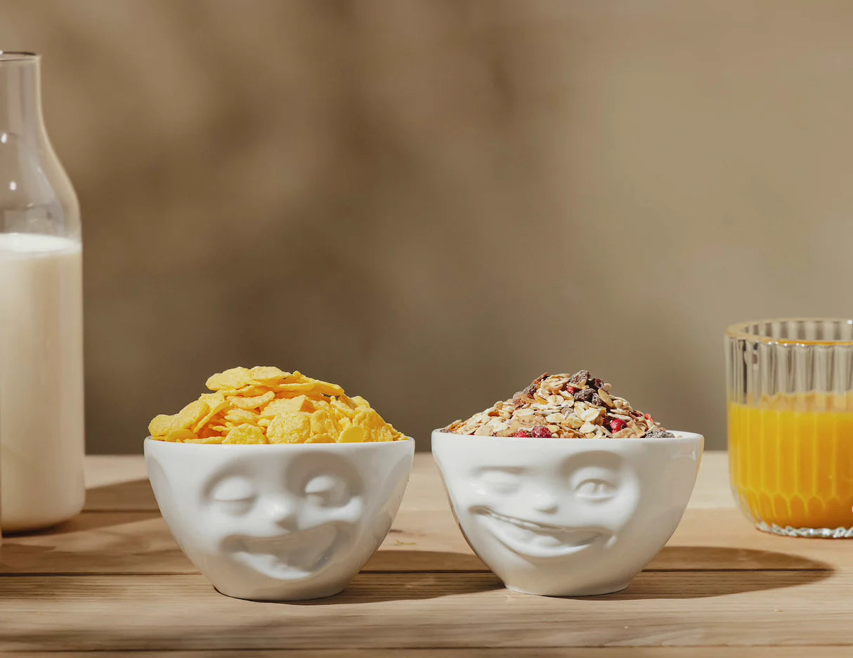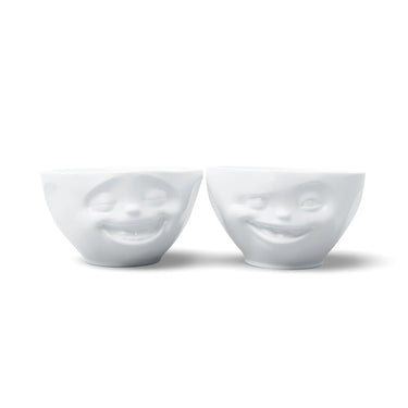Genuine hard porcelain set features two 6.5 oz. bowls in white, each with its own facial expression: One bowl with 'laughing' facial expression and one 'winking' facial expression.