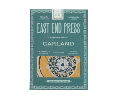 A mix of ten planets, stars and moons fill this garland, in deep blues and teals with splashes of metallic inks.
