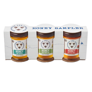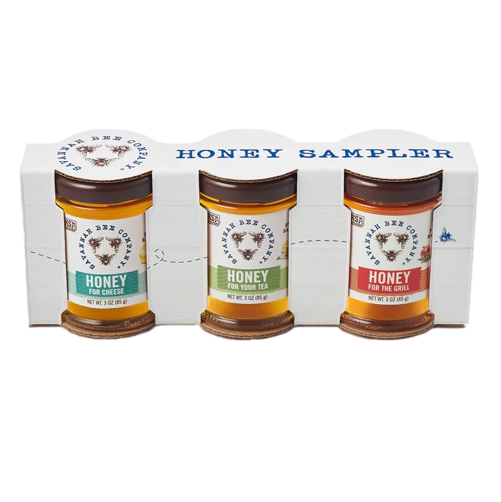 This Savannah Bee Honey Sample Set includes 3oz jars of Honey for Grilling, Honey for Tea, and Honey for Cheese. A perfect way to sample honey three flavors at a time!