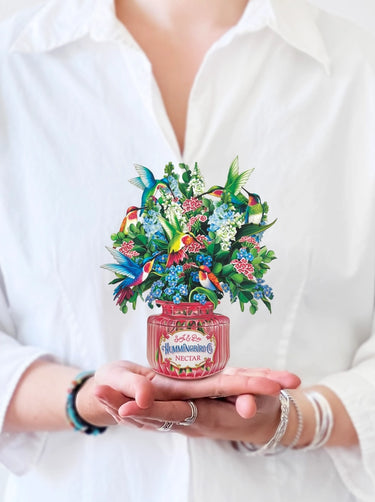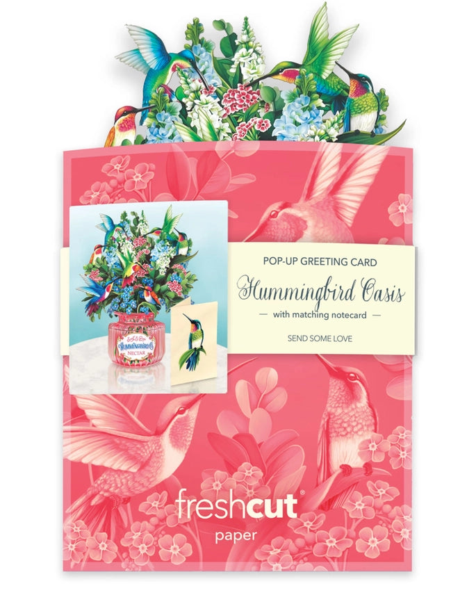 Bring a burst of color and joy with this Mini Hummingbird Oasis! This vibrant pop-up features a dazzling hummingbird hovering over tropical blooms—full of life, movement, and charm.