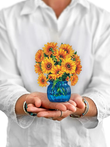 These bright and bold van Gogh inspired sunflowers cheer every room, teaming with positivity and joy. The bodacious bouquet features an elevated design of bursting sunflowers in an understated and elegant blue, glass vase.