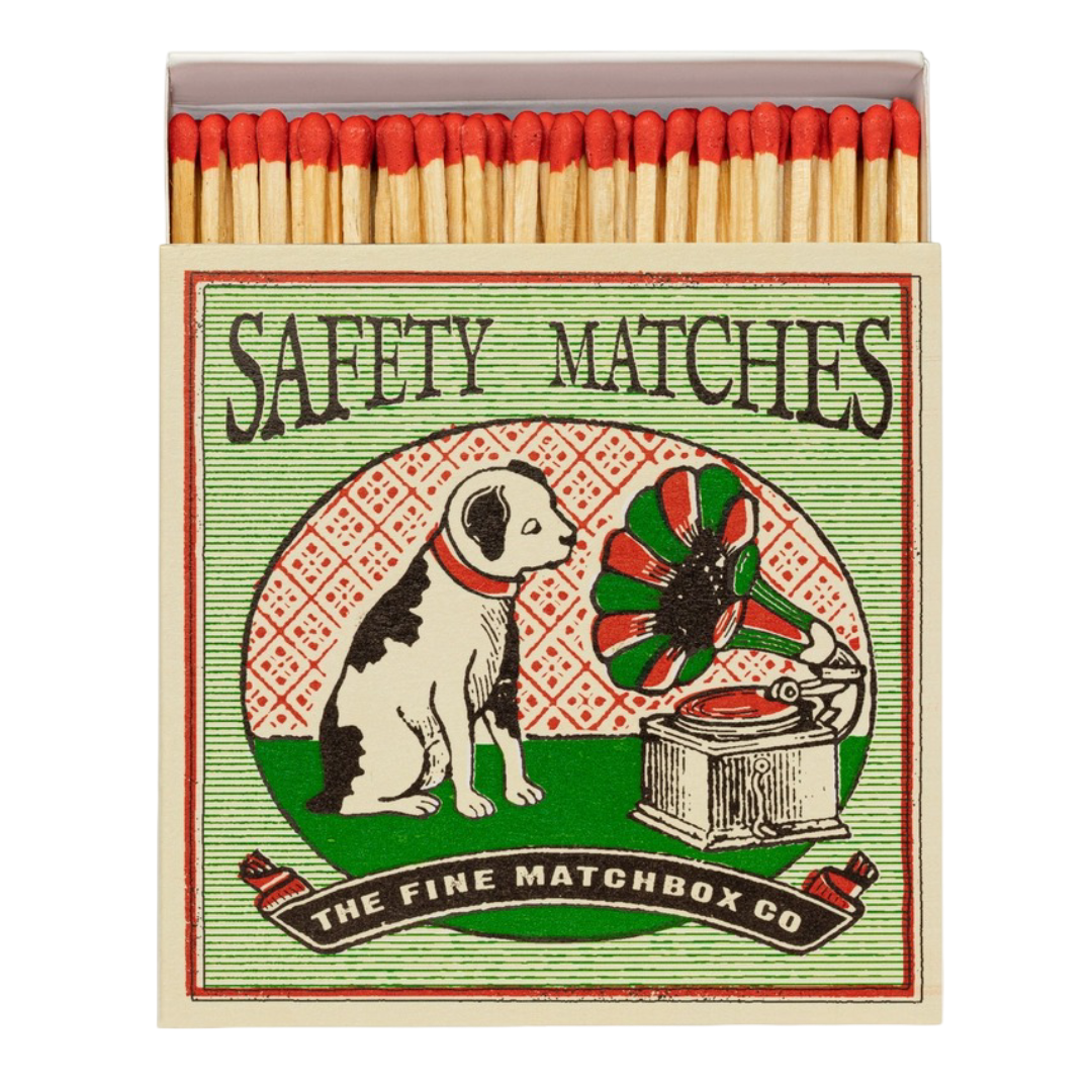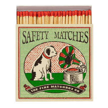 Dog & Gramaphone luxury safety matches features a gorgeous vintage design of a puppy listening intently to some good old fashioned music.