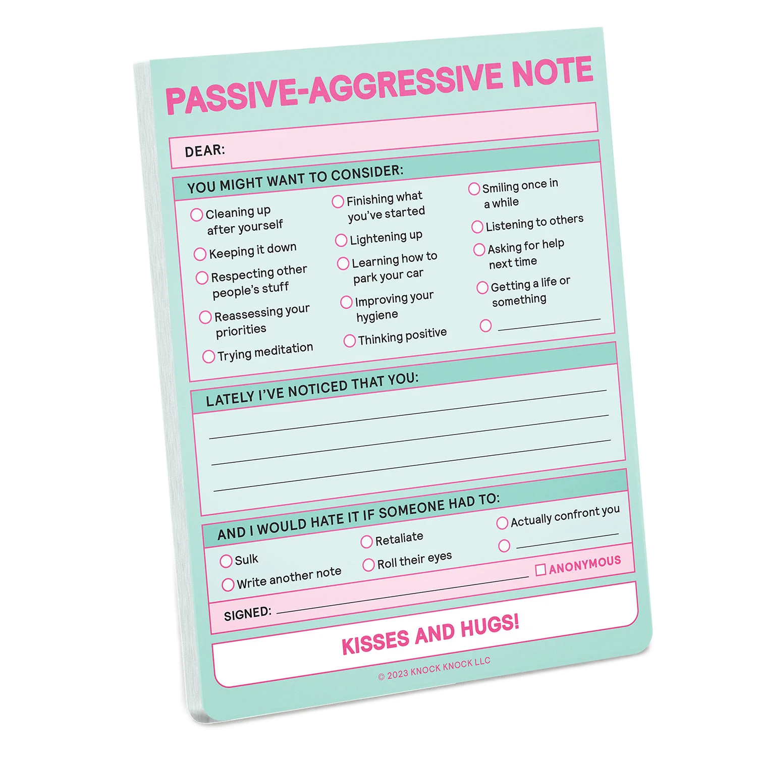 This passive-aggressive paper tantrum notepad lets you clearly but (somewhat) subtly address a range of behavioral failures in others including poor attitude and lackluster hygiene.