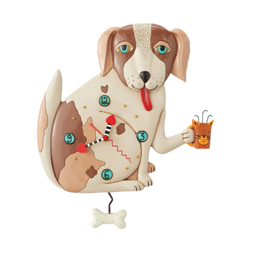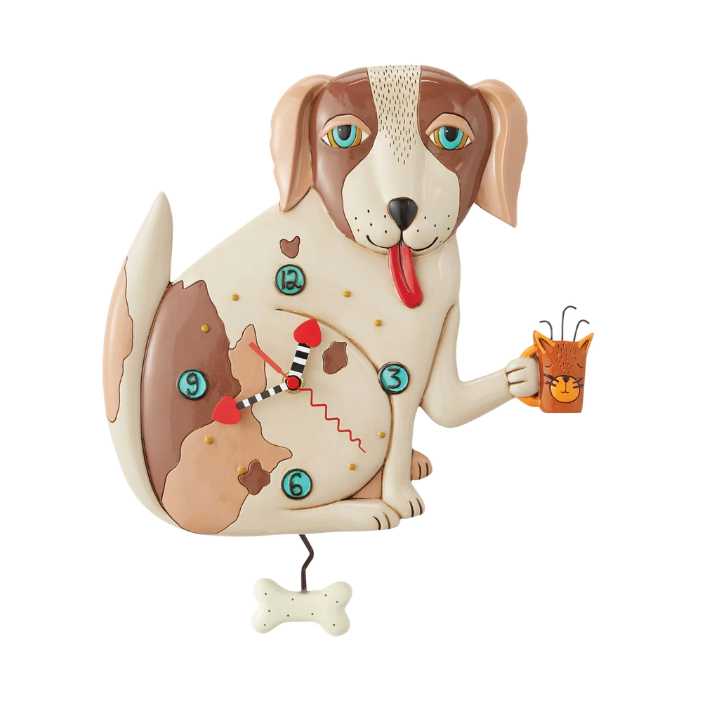 This fun pup is ready to start the day drinking out of his cat mug. The bone pendulum moves back and forth, it is sure to be a treat for later.