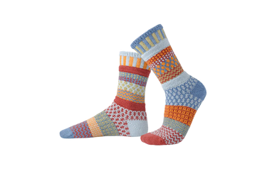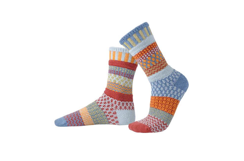 Colors in this sock: orange, sky blue, light blue, yellow-green and flame red.