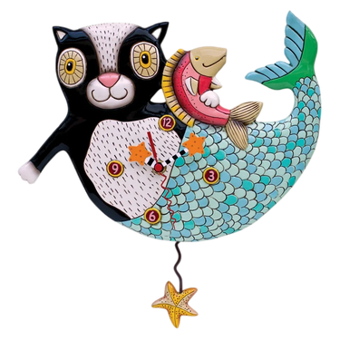 Handpainted sculptured clock features a fun pendulum that adds movement.