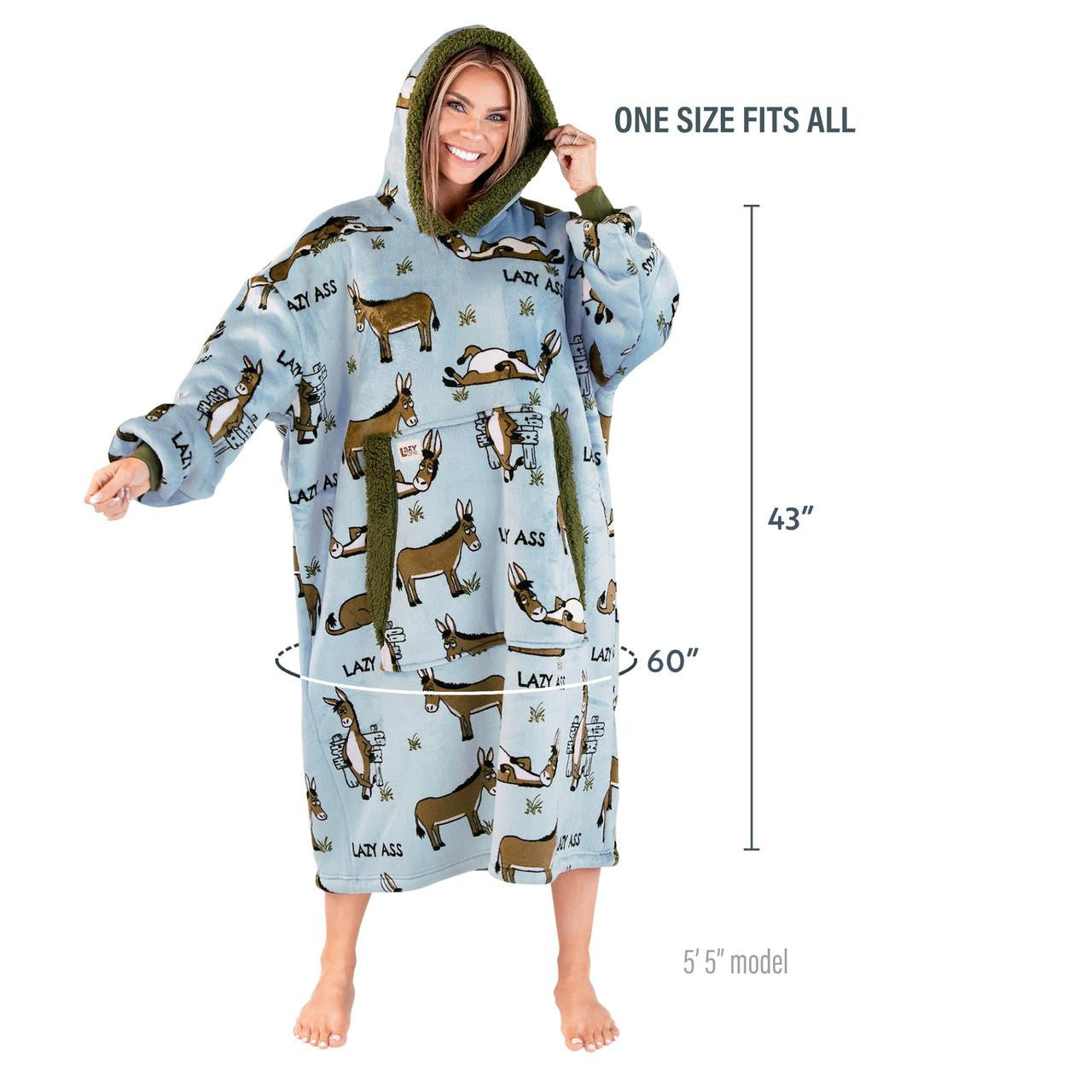 It's great to be lazy again with this Lazy Ass Blanket Hoodie. Featuring a fun all over donkey print perfect for anyone who wants to have a laugh and be comfy at the same time.