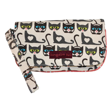 Holds bills, coins, credit cards and a bit more! Interior has coordinating polka dot fabric. Peace sign zipper pull, and a fold over flap with snap closure.