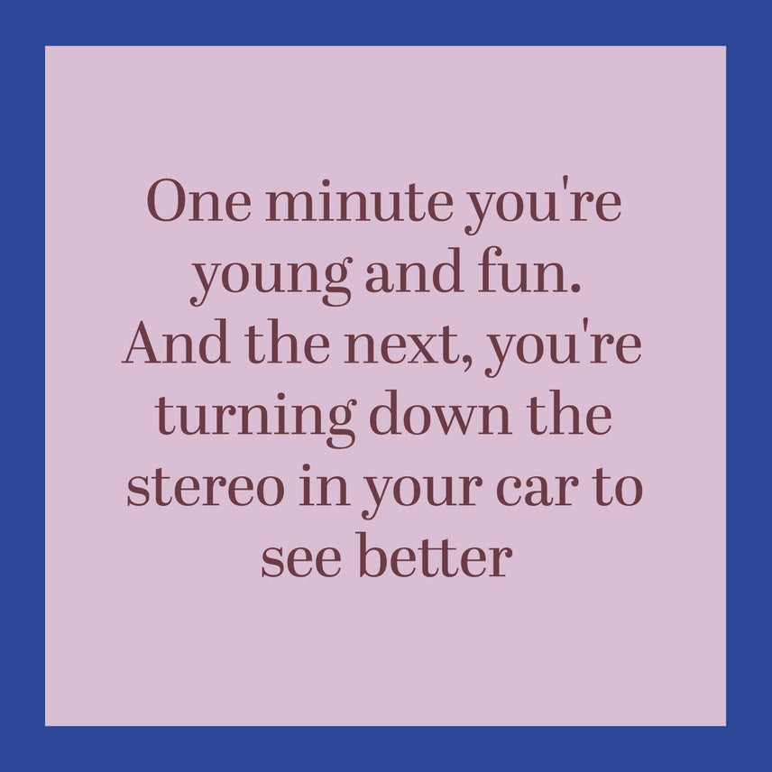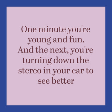 Front: One minute you're young and fun. And the next, you're turning down the stereo in your car to see better